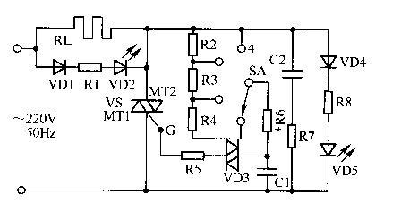 两只发光二极管VD2、VD5是指示灯,它们的亮度会随着档位的调节反比例变化,输出电压最高时(功率最大)VD2最亮,输出电压最低时(功率最小)VD5最亮。R5是限流电阻,用来保护可控硅。电阻R7、电容C2为吸收回路,用以滤除电磁干扰脉冲。双向可控硅根据电炉的功率来选择。