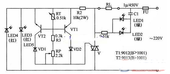 RT、VT1、VT2和RP组成温控触发电路,双向晶闸管V为温控茄子视频ios下载版。LED3、LED4反向连接,提供2.3V交流电压。电路接通后,热敏电阻RT两端交流电压URT》0.6V,交流正半波时VT1导通,经二极管VD1触发,V导通,交流负半波时VT2导通,经VD2负向触发,V导通,使电阻丝RL流过电流加热。温度升高到某一数值,调整电位器RP,使URT《0.6V,三极管截止,V不被触发导通,从而实现控制温度的目的。
