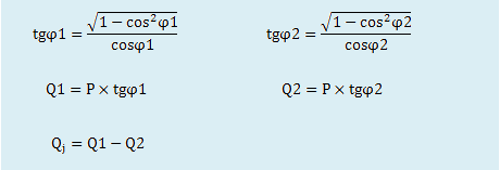 cosφ1:没有加装无功补偿装之前的功率因数。 cosφ2:希望将提高到多大的功率因数。
