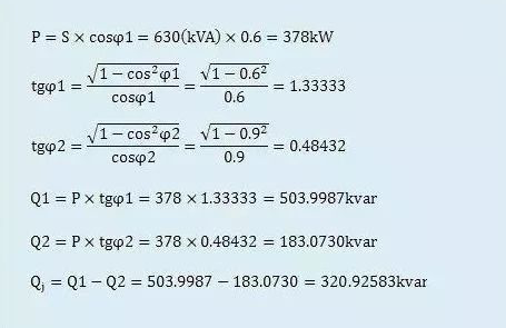 案例:假设某专变用户的变压器容量是630KVA,功率因数每个月均为0.6左右,导致该用户的力率调整电费被考核,现需要将功率因数提高到0.9左右,需要配置多大的无功补偿装置?
