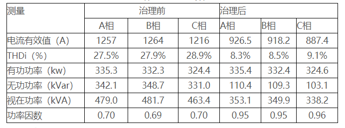 通过对现场负荷进行测试,采用电容器组加有源滤波治理前后A、B、C三相电压、电流测量结果整体情况汇总如下所示: